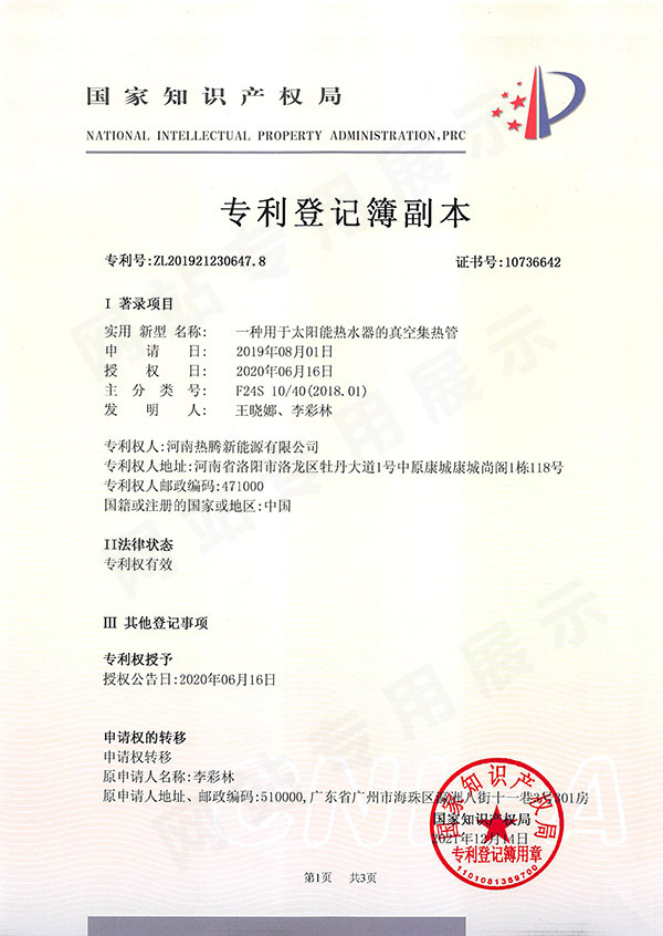 专利一种用于太阳能热水器真空集热管5(1-1)